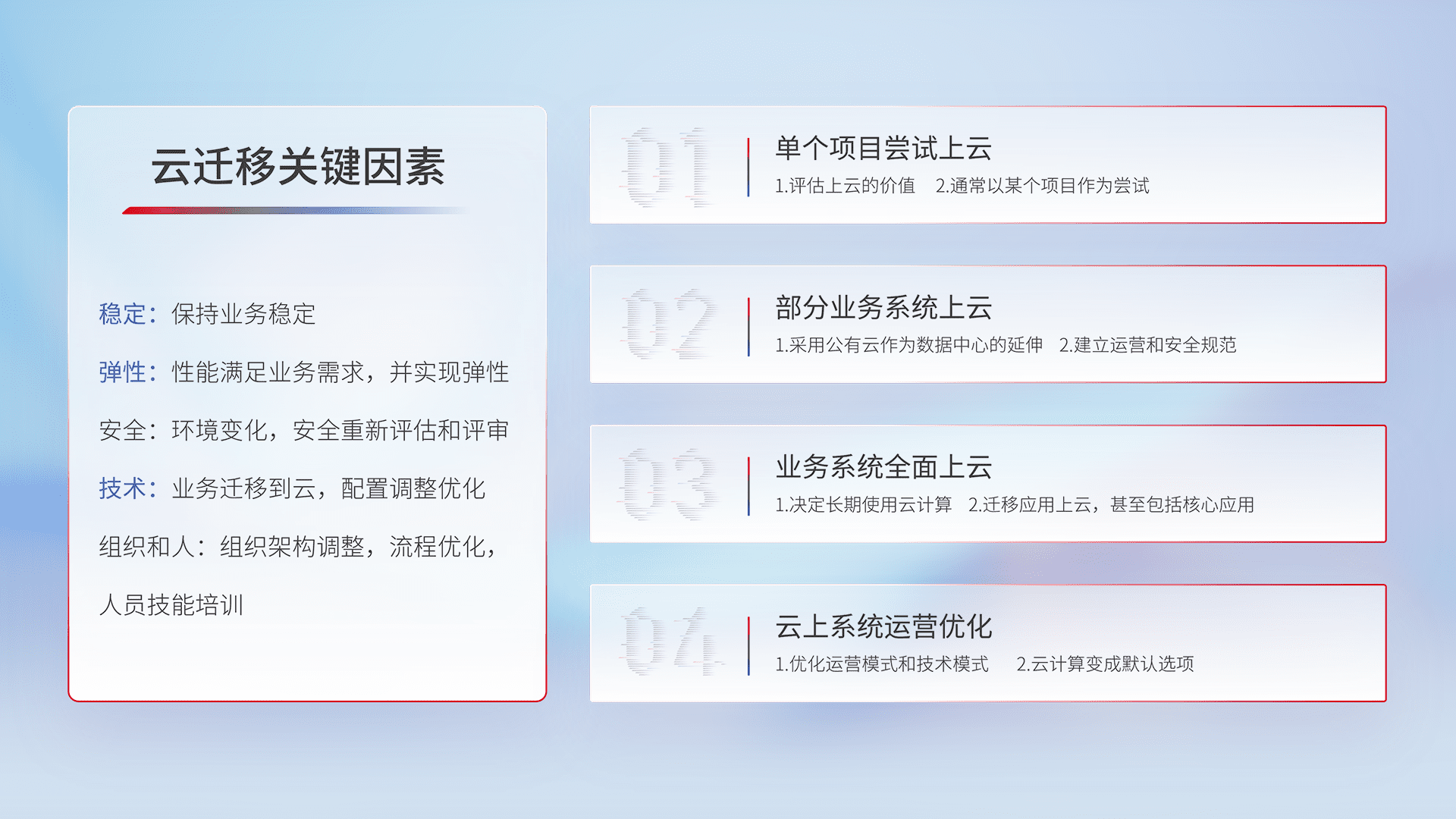 结合实际业务,,从规划设计、、云平台选型、、、云原生改造、、、、数据迁移、、集成交付,,,,迁移全过程为客户识别最佳上云路径,,,,做好风险识别管理,,设计网络架构、、身份权限、、、安全审计合规、、、、操作审计、、、、日志审计、、监控告警策略、、多站点容灾设计等,,对云上基础设施进行整体规划,,,,提升IT治理水平,,,,以满足弹性、、、高可用、、高性能的需求。。。。