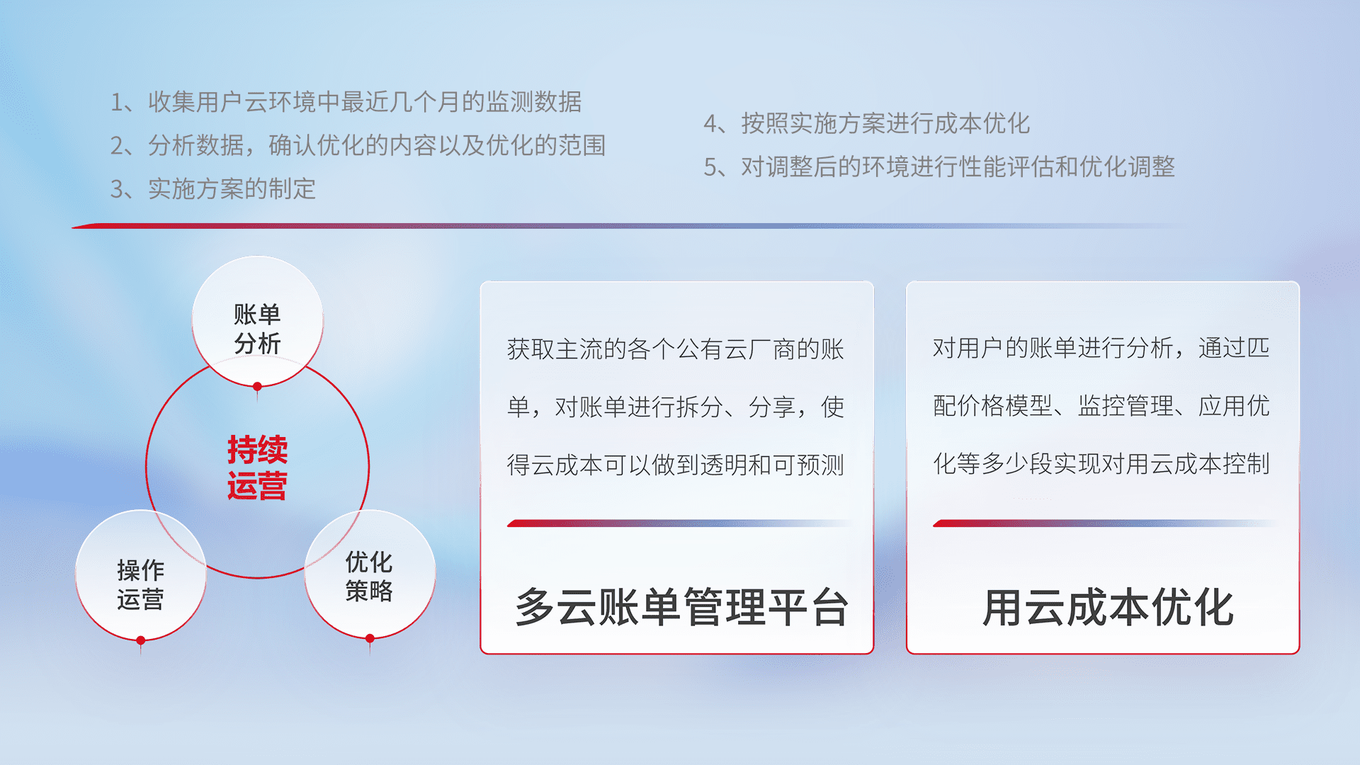通过多云纳管,,以统一的资源数据模型把客户的云资源进行抽象和封装,,,,进而实现对多云资源的统一操作,,,,保障云资源管理的可靠性、、、、稳定性与可用性。。量身定制化运维内容,,配置、、、开发运维、、、、补丁管理、、、备份、、、监控、、认证和访问管理、、、审计和日常巡检等,,,,保障在用云过程中的可靠度,,,稳定度以及高可用率。。